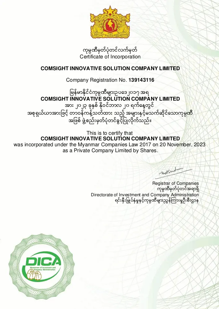 Comsight Innovative Solution Co., Ltd. was established in February 2023 and officially recognized through company registration on November 20, 2023, specializing in HR and Regulatory Compliance services. We are dedicated to helping organizations achieve their goals and drive sustainable business growth while maintaining a strong organizational image.